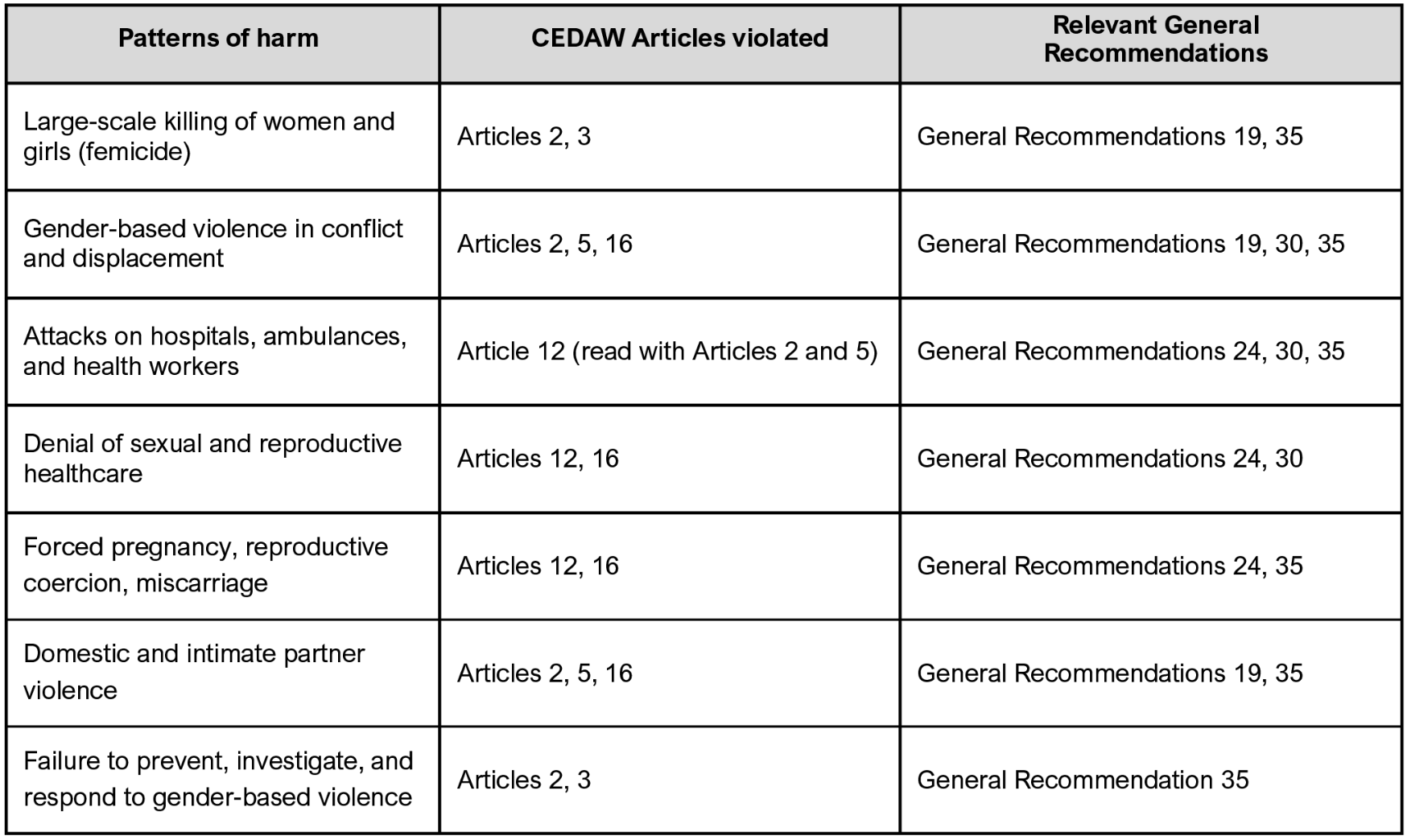 This annex provides an analytical mapping of the patterns of harm documented in this emergency alert to relevant provisions of CEDAW and its General Recommendations. It is intended to support legal clarity and internal review by illustrating how large-scale violence against women and girls, attacks on healthcare, denial of SRHR services, and failures to prevent and respond to gender-based violence engage States’ obligations under international human rights law. The annex is complementary to the narrative section and does not constitute a comprehensive legal determination.